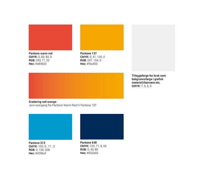 Profilfargene brukes i all skriftlig og digital kommunikasjon og skal prege uttrykket. I tillegg til de rene fargene er det utviklet en gradient fra rød til gulorange. Denne kan benyttes på større flater - gjerne kombinert med profilelementet i Newton. Se eget kapittel.
