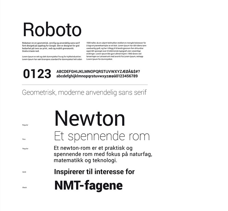 På all trykt kommunikasjon benyttes Roboto som skrifttype. Dette er en tydelig, lettlest, moderne og anvendelig skrift. Roboto-familien er stor og det finnes mange snitt og varianter.