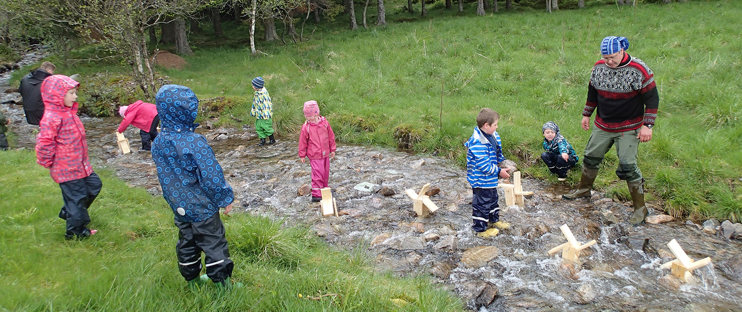 Barna får også snekre sammen hvert sitt vannhjul som de tester ut i bekken. Det er et fint syn når man ser at opptil 10-12 vannhjul står og snurrer samtidig i bekken. Barna blir veldig stolte over det de har laget, og jeg har fått høre om vannhjul som senere er testet i både badekaret og i dusjen. Et av barna måtte til og med ha vannhjulet med seg i senga da han skulle legge seg.