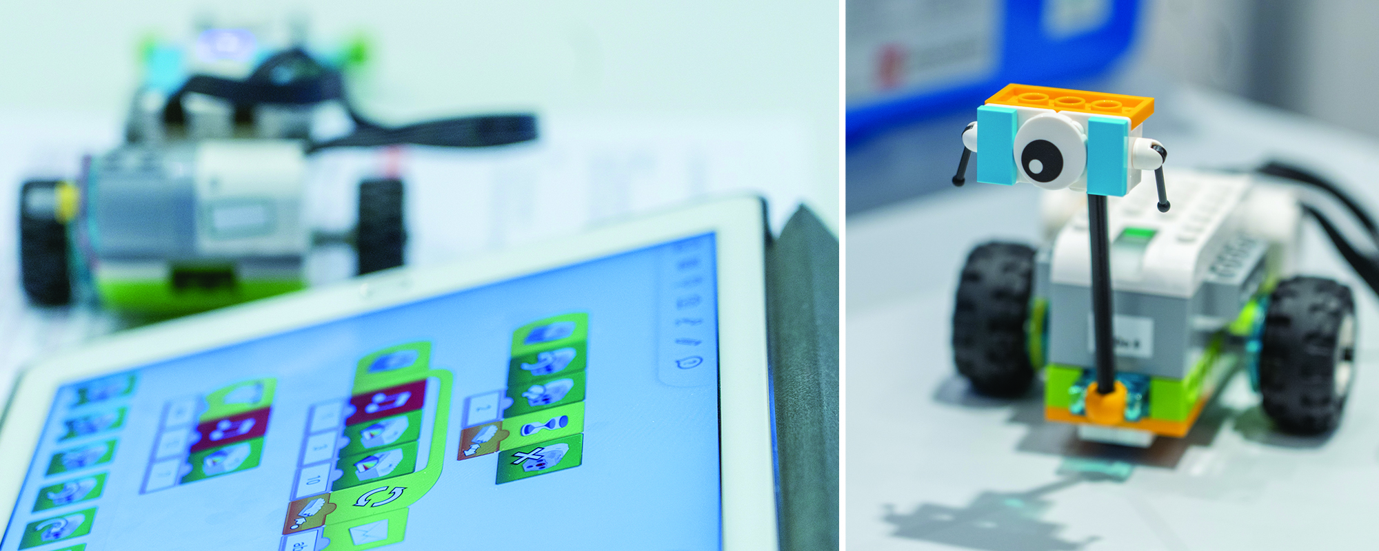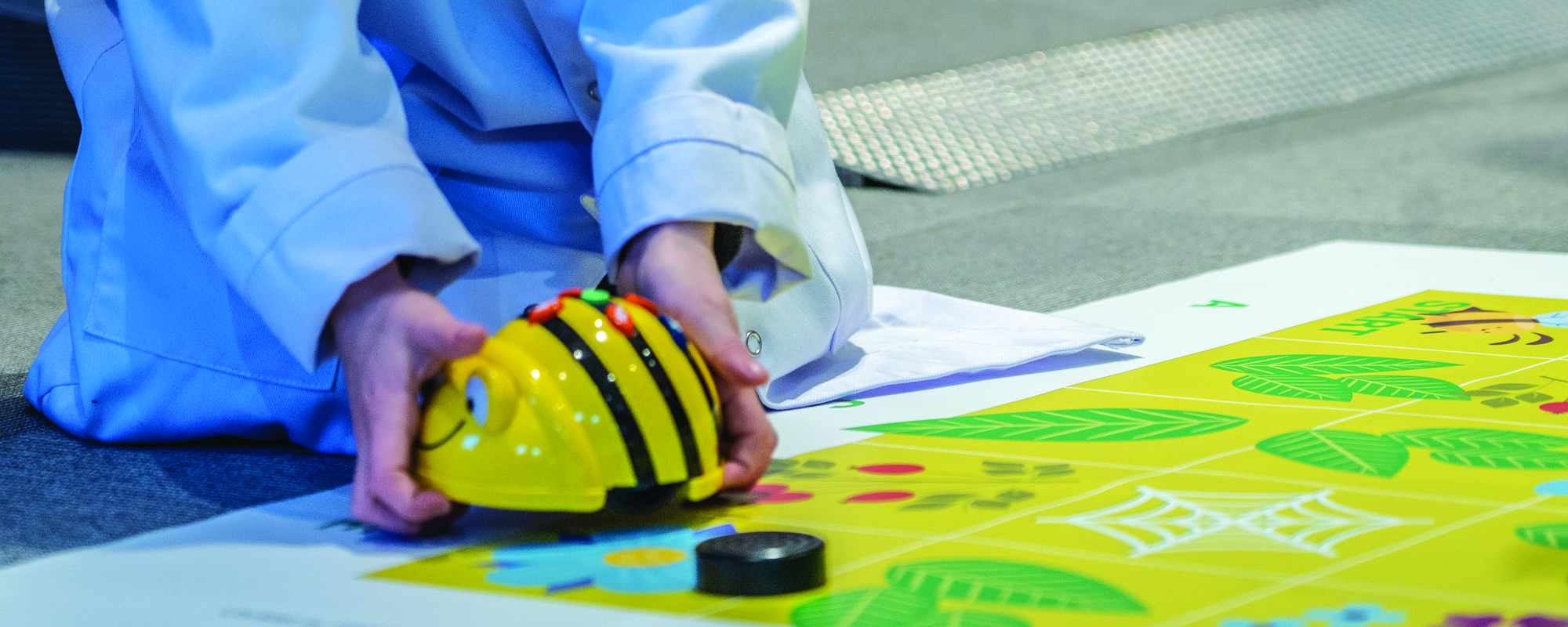 I Newton-rommet er undervisningsdagen akkurat kommet i gang, og på gulvet ligger en gjeng 5.-klassinger og kjører med robotene sine. Newton-læreren og klasselærer følger med, og veileder der det trengs.